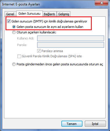 4- Giden Sunucusu sekmesine tıklayın ve aşağıdaki gibi ayarlayın. Tamam'a tıklayın. Sorunsuz bir şekilde mail gönderebilirsiniz.