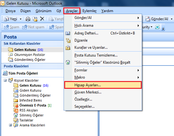1- Araçlar Sekmesinden Hesap Ayarları'na tıklayın.