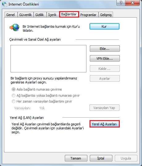 3- Bağlantılar sekmesine gelin ve Yerel Ağ Ayarları'na tıklayın.